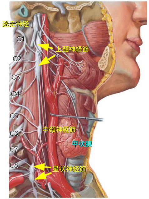 ・星状神経節:のど仏辺りにある交感神経のかたまり、頭を前に倒すと神経節が圧迫され、交感神経が興奮する